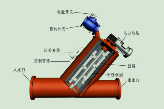 2、電機(jī)帶動過濾器濾網(wǎng)內(nèi)的清洗刷,被濾網(wǎng)所攔截下來的雜質(zhì)從排污閥排出。清洗時系統(tǒng)不斷流,過濾器的整個運(yùn)行過程由隨機(jī)配備的一個 智能控制箱來控制,控制方式可選壓差、時間、手動