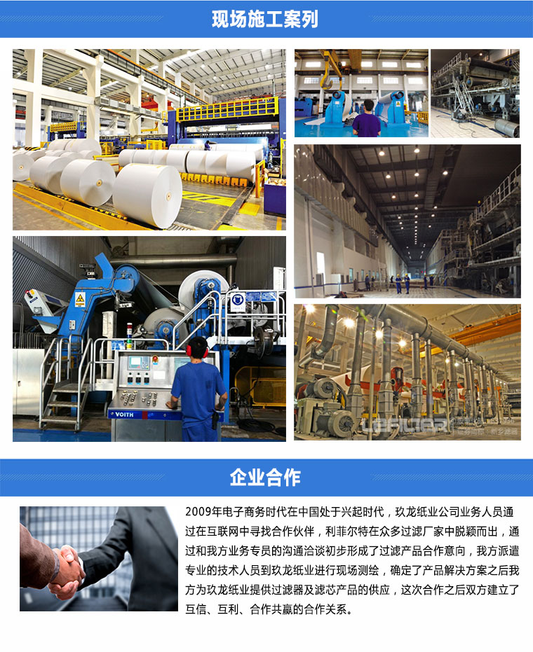 2009年電子商務時代在中國處于興起時代,玖龍紙業公司業務人員通過在互聯網中尋找合作伙伴,利菲爾特在眾多過濾廠家中脫穎而出,通過和我方業務專員的溝通洽談初步形成了過濾產品合作意向,我方派遣專業的技術人員到玖龍紙業進行現場測繪,確定了產品解決方案之后我方為玖龍紙業提供過濾器及濾芯產品的供應,這次合作之后雙方建立了互信、互利、合作共贏的合作關系。