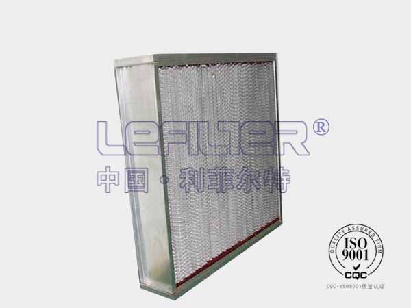 耐高溫高效過濾器使用有隔板設計,波紋形隔板可以準確地保持褶層間距,在較小阻力下,較大限度地利用濾料,濾料折彎時有兩道壓痕,使其在隔板的尾端開成鍥形盒式褶層,鍥形盒式褶層可以防止濾料破損。
