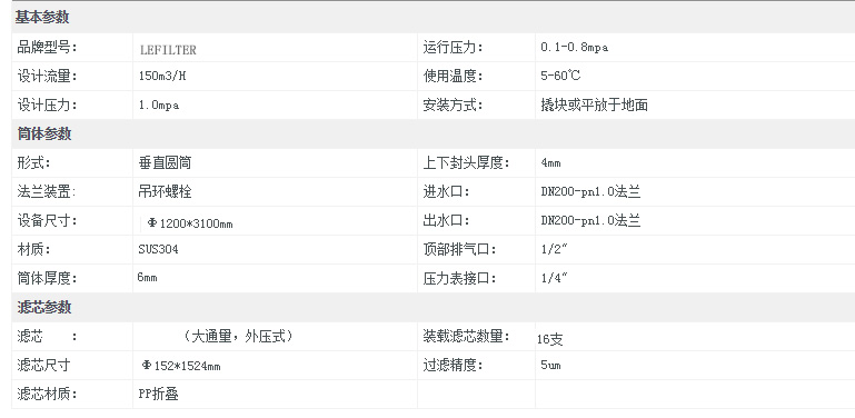 利菲爾特大流量保安過濾器結構為圓柱形殼體,材質為304或,316L不銹鋼;配以單支或多支濾芯。